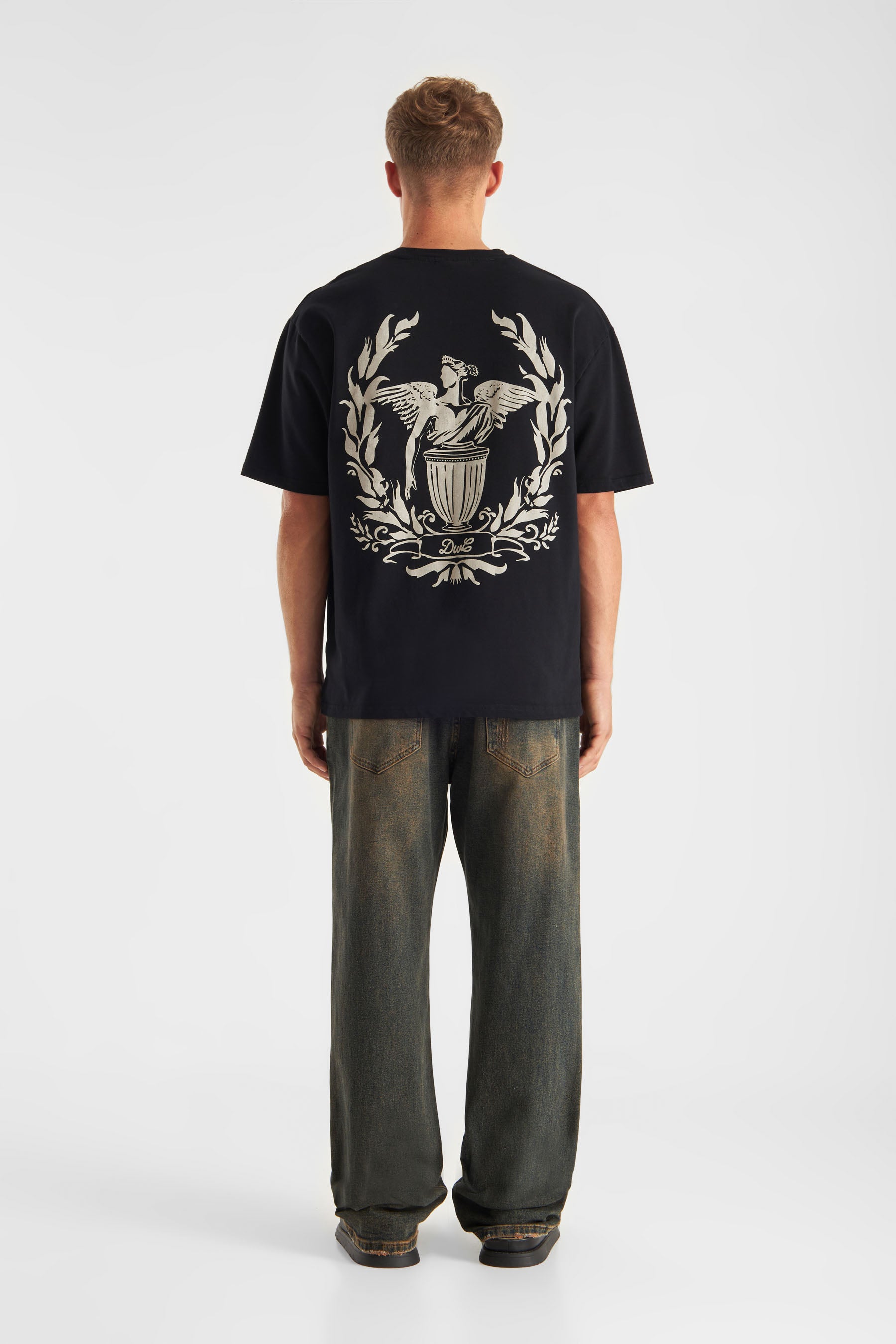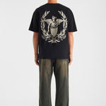 Introducing Alaric, one of our exclusive Black Friday tees with a unique twist. This design features an intricate, Roman-inspired cracked and damaged backprint showcasing a winged goddess atop a trophy vase, symbolizing victory and timeless elegance. Surrounded by a laurel wreath, it pays homage to the grandeur and heritage of the Roman Empire. The print is made in a special crack ink to give it a vintage feeling.
