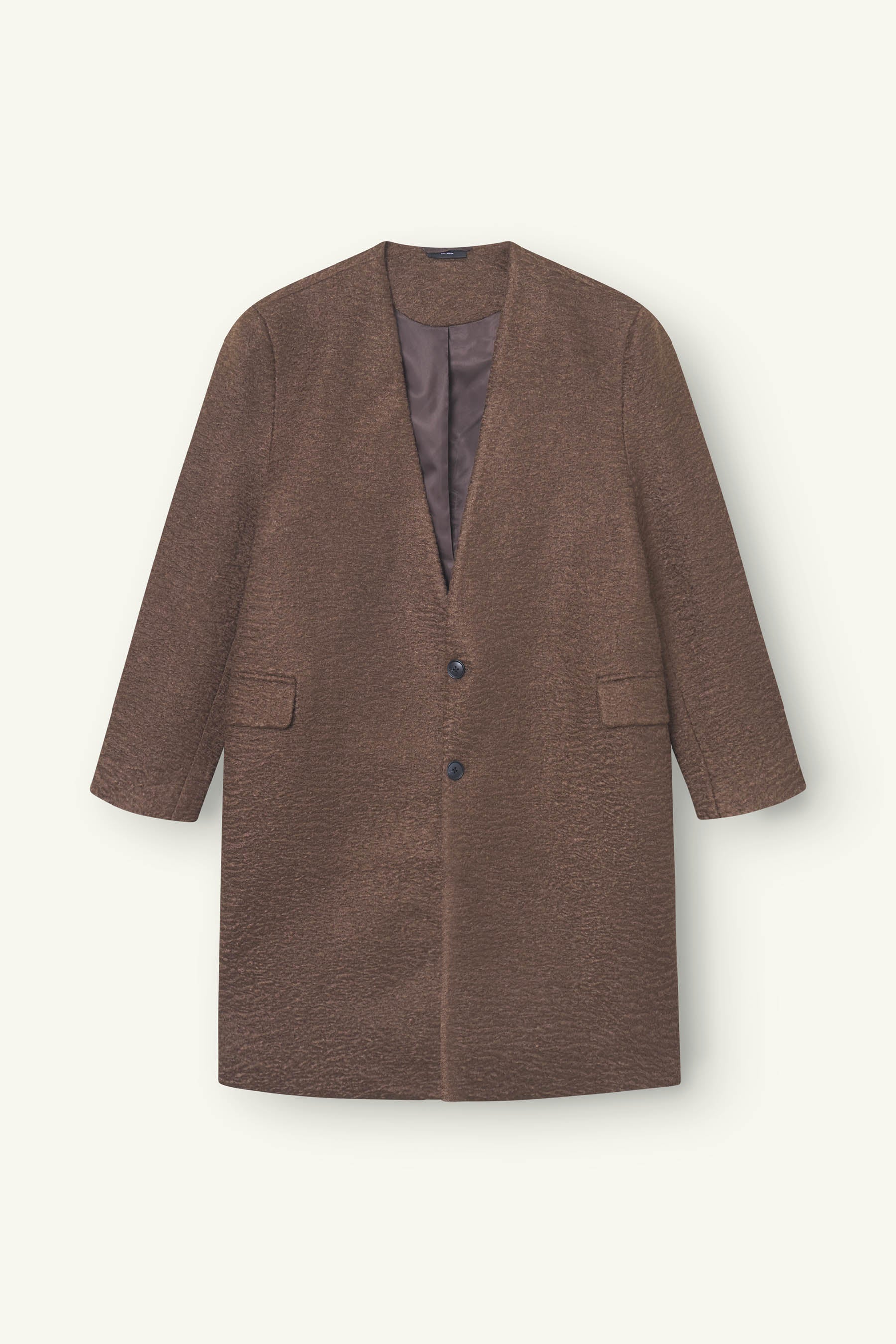 Understated elegance. The Calindra Collarless Overcoat blends classic tailoring with modern outerwear needs. Its collarless neckline and sleek profile make it perfect for layering without bulk. The textured “hairy” finish adds warmth both visually and physically, while flap pocket details combine form and function. Fully polyester build gives you resilience, and the design delivers elevated protection with timeless appeal.
