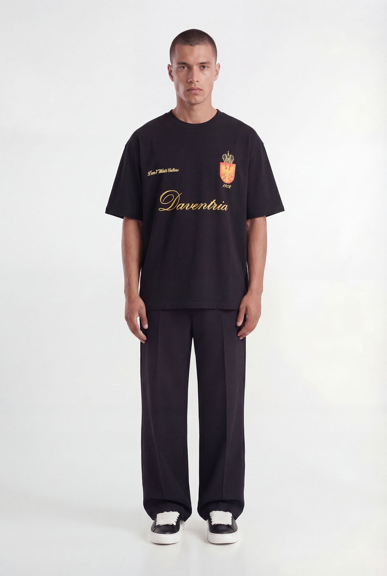 Cultural pride reimagined. The Daventria T-shirt is part of a collaborative collection celebrating shared heritage and craftsmanship. Inspired by historic football aesthetics, this piece fuses legacy design with modern streetwear sensibility. The bold screenprinted graphics and premium cotton construction create a statement that connects the past with the present, a tribute to authenticity and local culture. Part of the exclusive Go Ahead Eagles x Don’t Waste Culture Capsule.