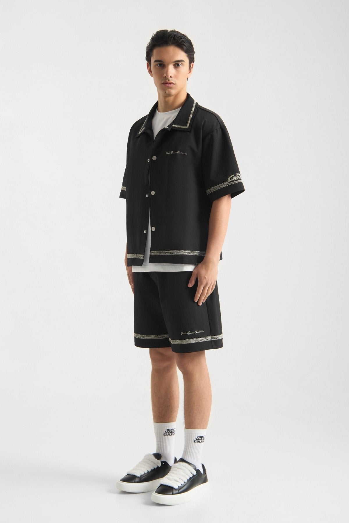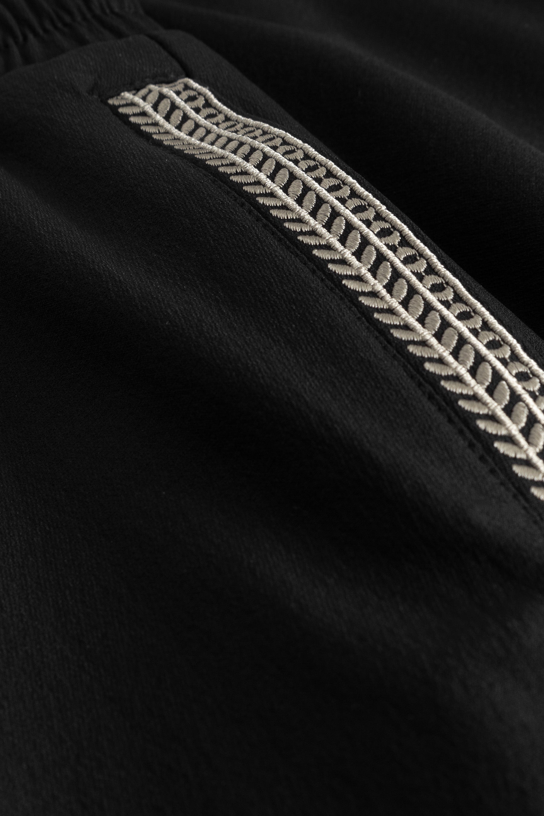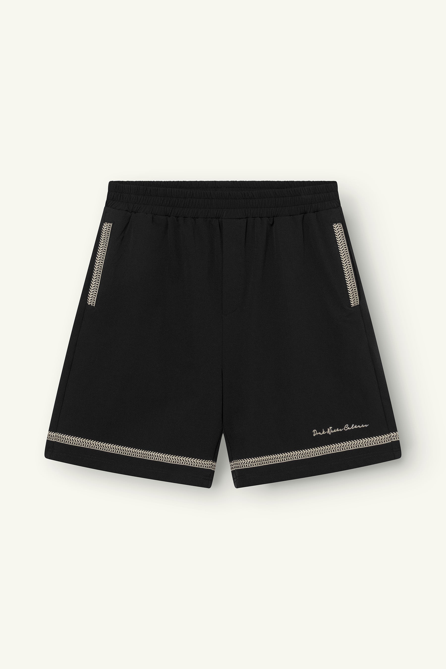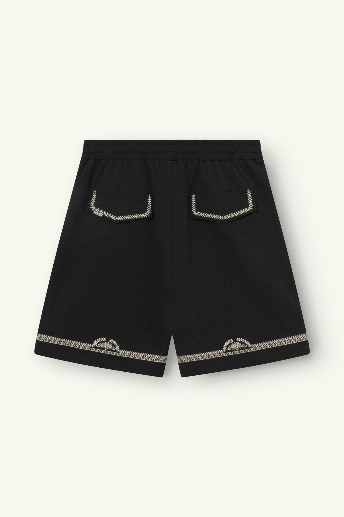 Crafted from an ultra soft nylon blend with four-way stretch, the fabric feels smooth and flexible while maintaining shape. The regular fit offers ease without excess, allowing the embroidered pattern to add depth without overwhelming the garment. The lightweight structure makes them suitable for warmer days while retaining a composed appearance.