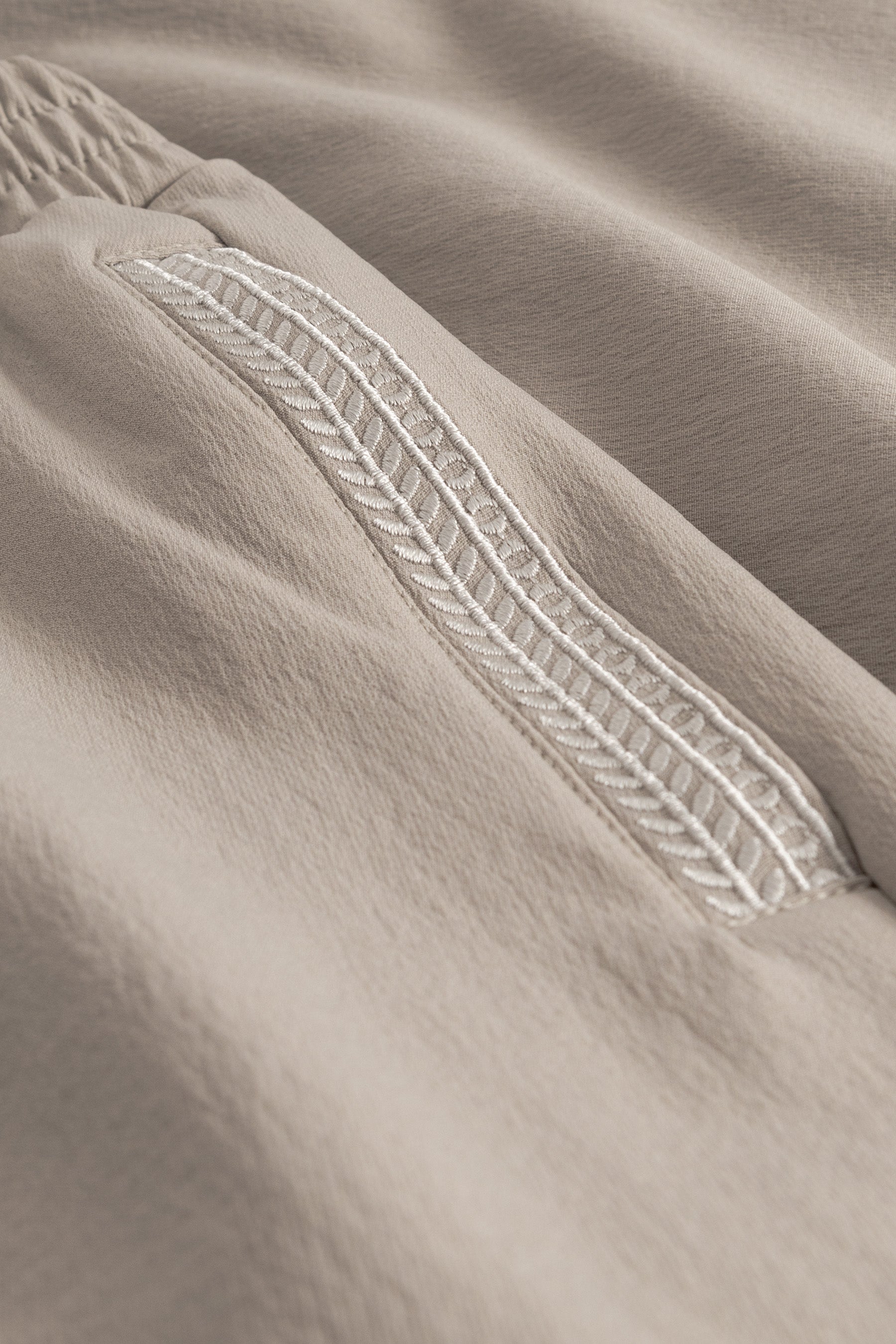 Crafted from an ultra soft nylon blend with four-way stretch, the fabric feels smooth and flexible while maintaining shape. The regular fit offers ease without excess, allowing the embroidered pattern to add depth without overwhelming the garment. The lightweight structure makes them suitable for warmer days while retaining a composed appearance.
