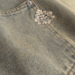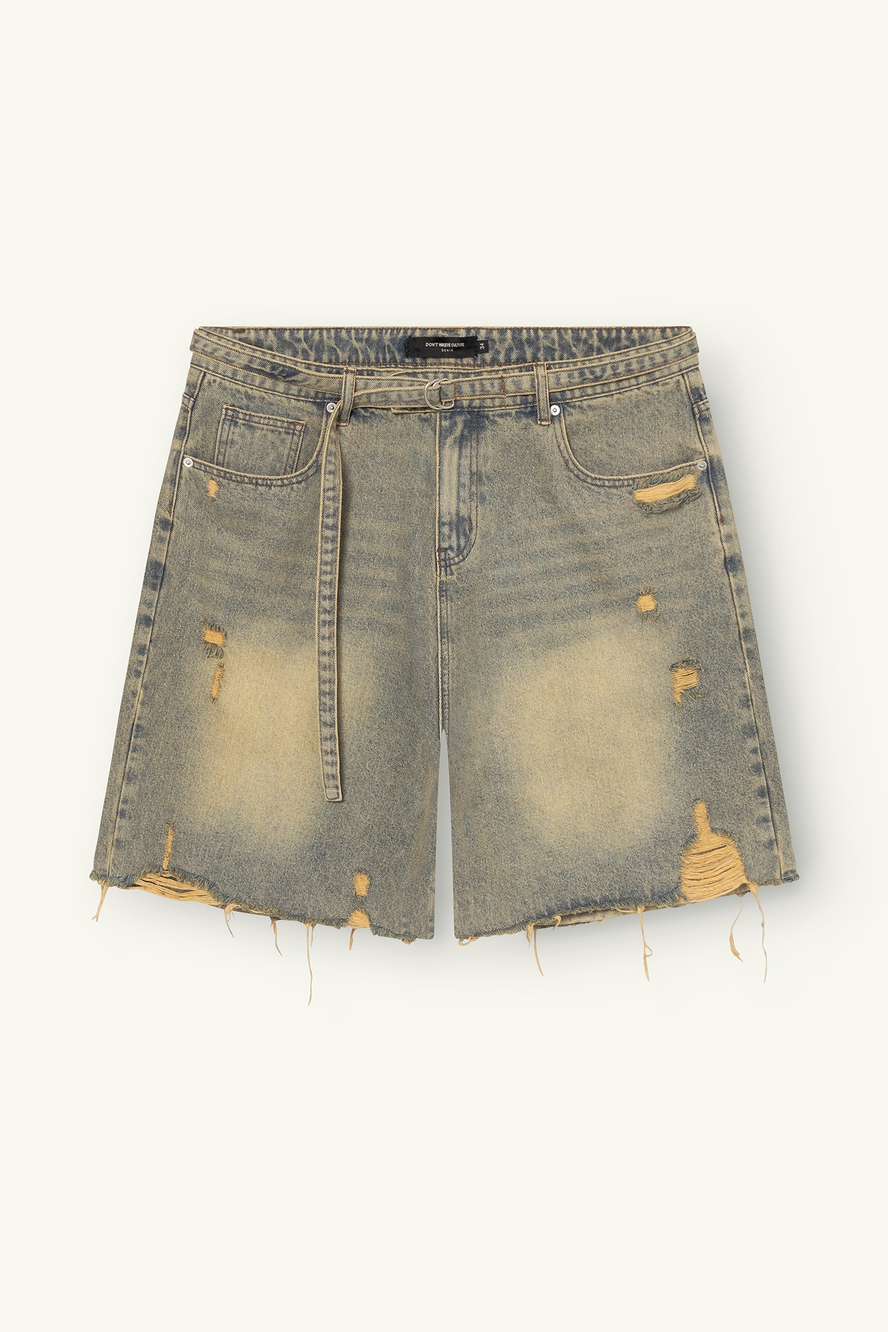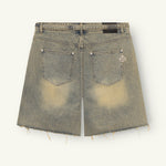 Crafted from stretch denim with 98% cotton and 2% elastane, the fabric offers structure with subtle flexibility. The pale wash softens the surface and enhances the worn character, while the longer length and wider hem create a strong outline that falls over the knee. Distress details and a raw edge hem add texture without overwhelming the piece.