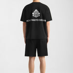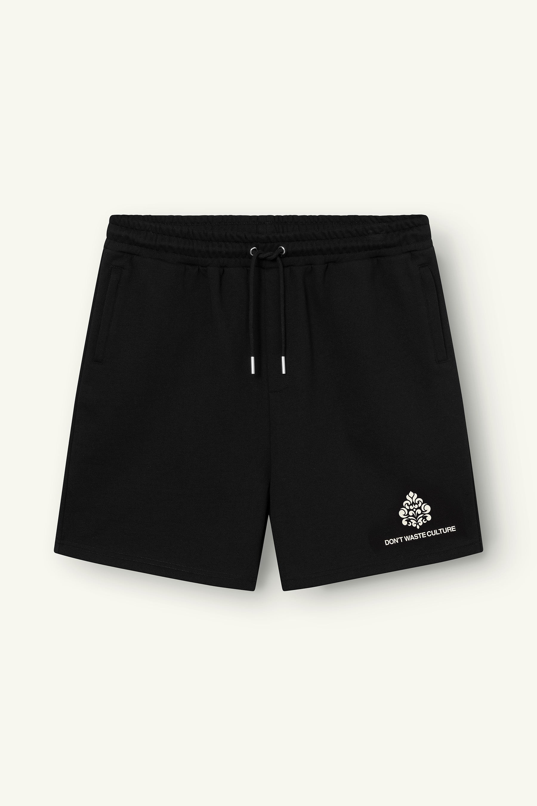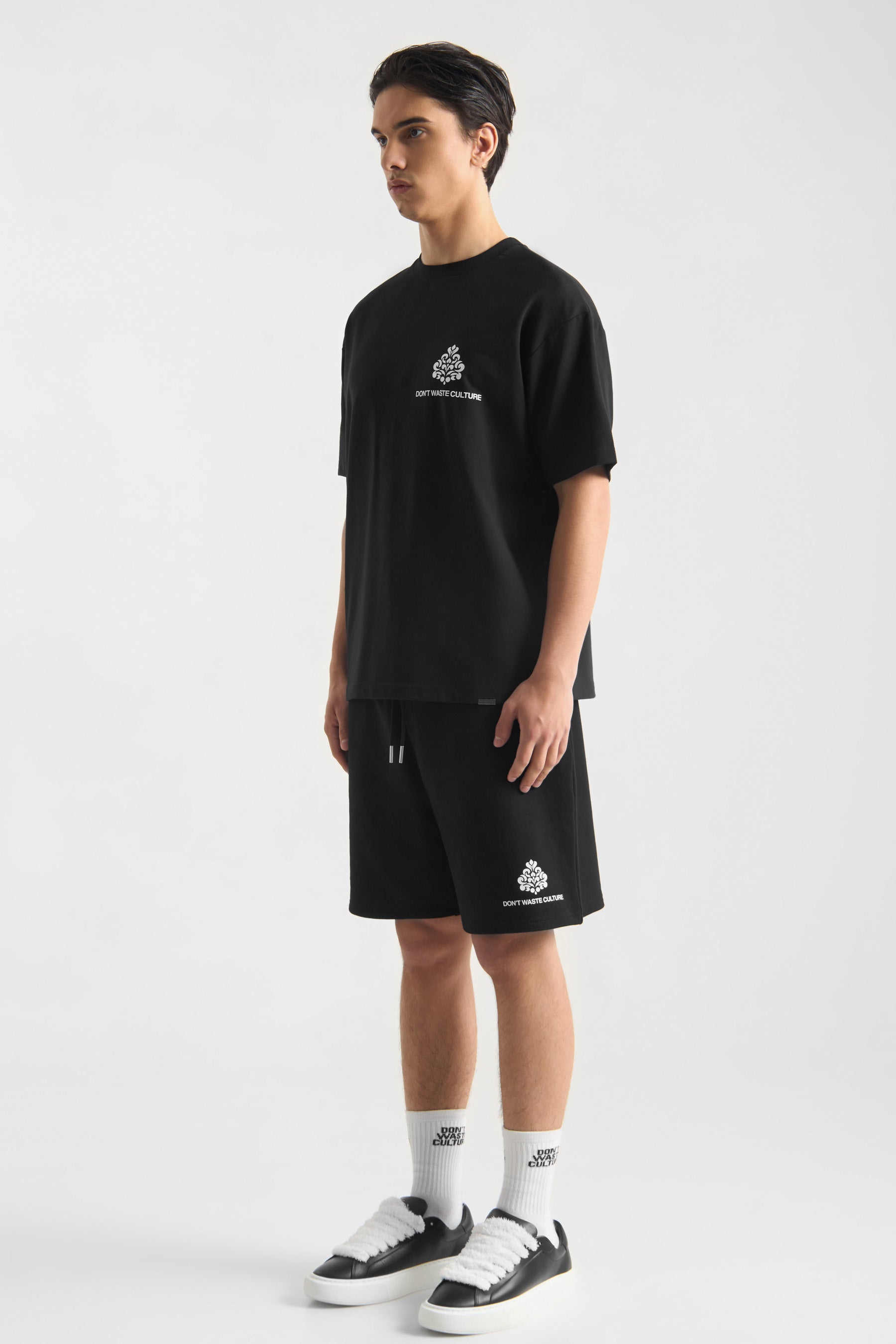 Cut from heavyweight 360gsm cotton, the fabric feels dense and durable while remaining comfortable against the skin. The regular fit offers ease without excess, creating a silhouette that sits naturally on the body. The screenprinted DWC ornament mark on the leg adds a subtle point of identity without dominating the piece.
