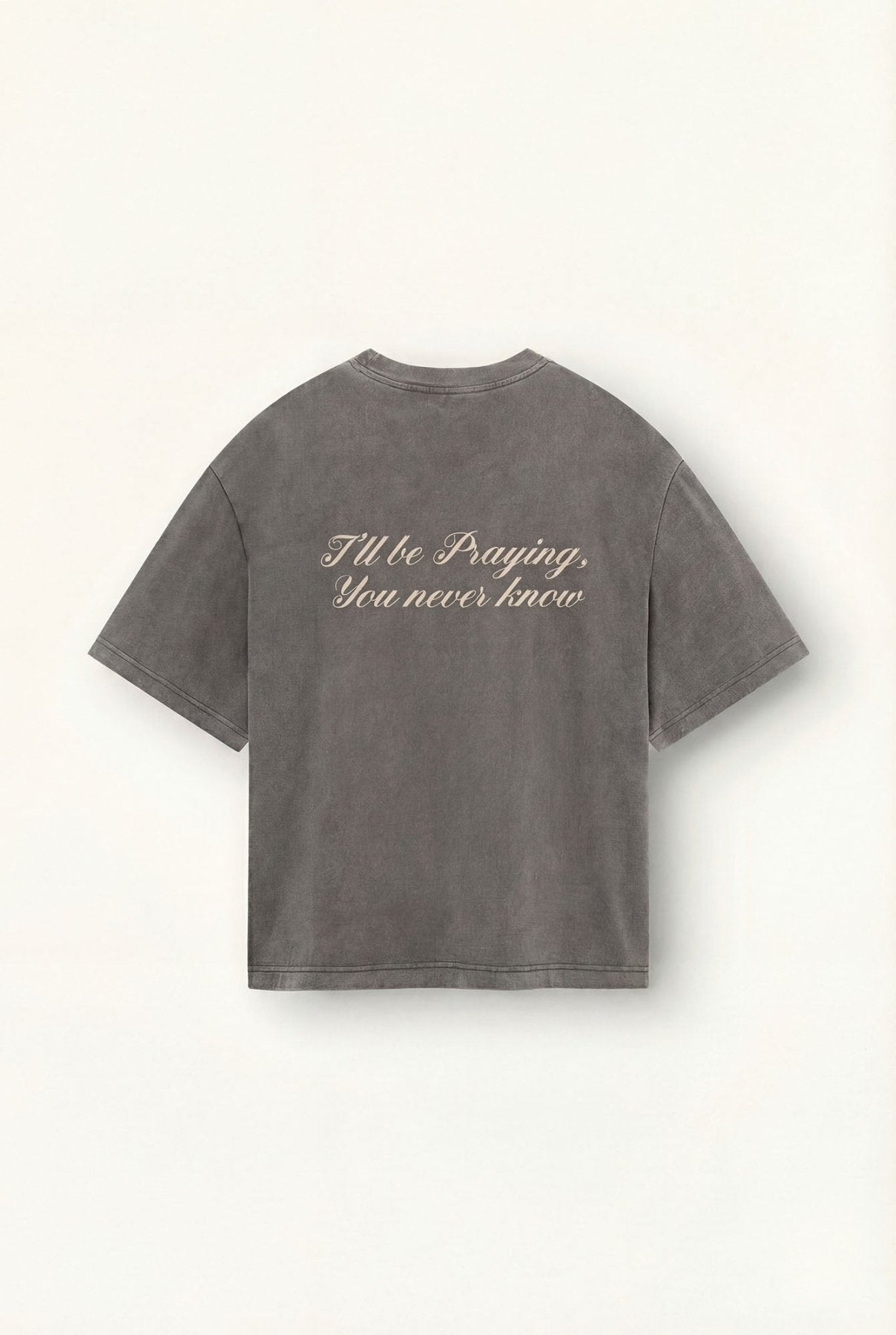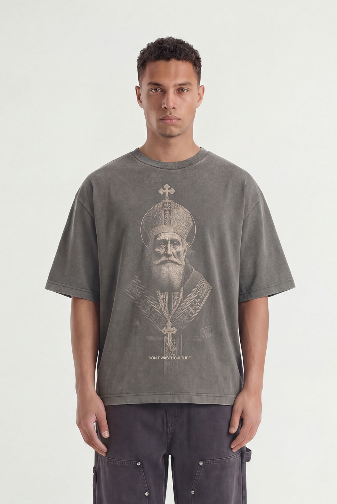 Crafted from heavyweight 250gsm cotton, the fabric is substantial and structured. The heavy vintage wash softens the surface and gives the washed black base a worn, time-aged character. Cut in a boxy silhouette with wider sleeves and a slightly shorter length, the proportions feel deliberate and balanced. The realistic Saint Nicholas print on the front carries visual weight, while the quote on the back completes the narrative.